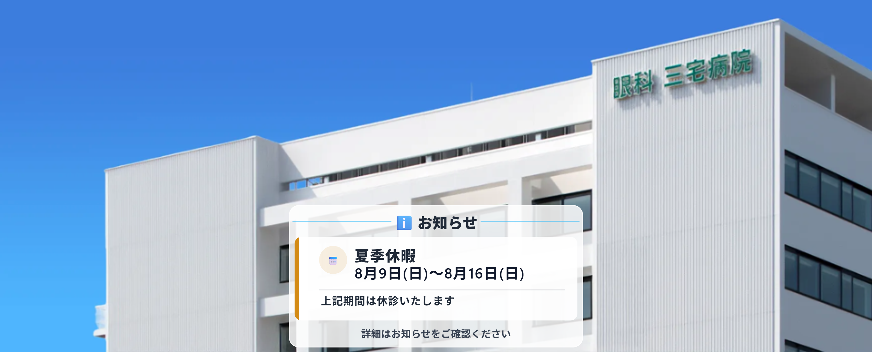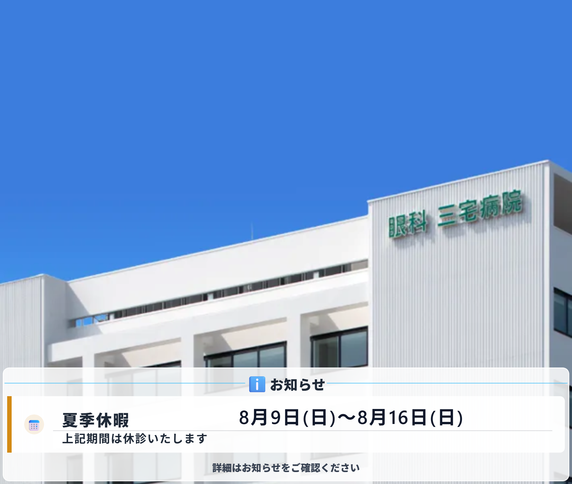 専門的な診療白内障手術に加え、緑内障、網膜硝子体、レーザー手術などの様々な手術に対応しています。また、専門家の少ない小児眼科および神経眼科等の専門医師による診療も行っています。 -