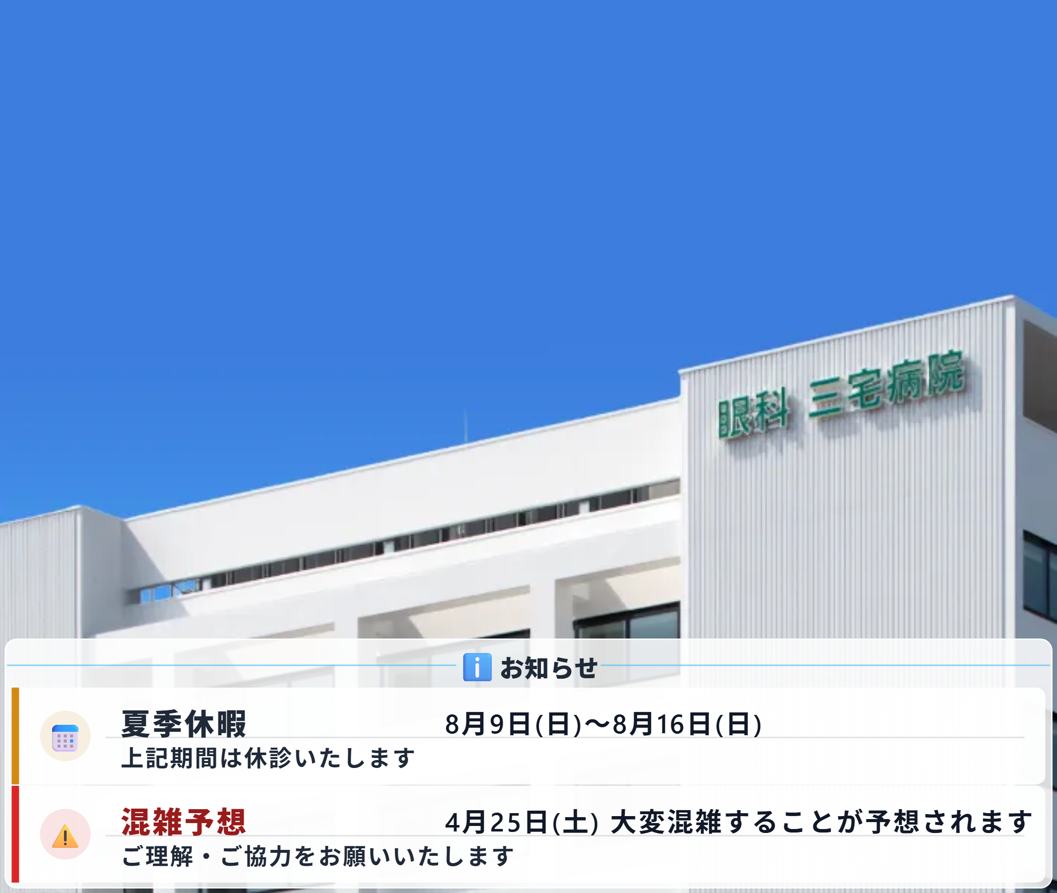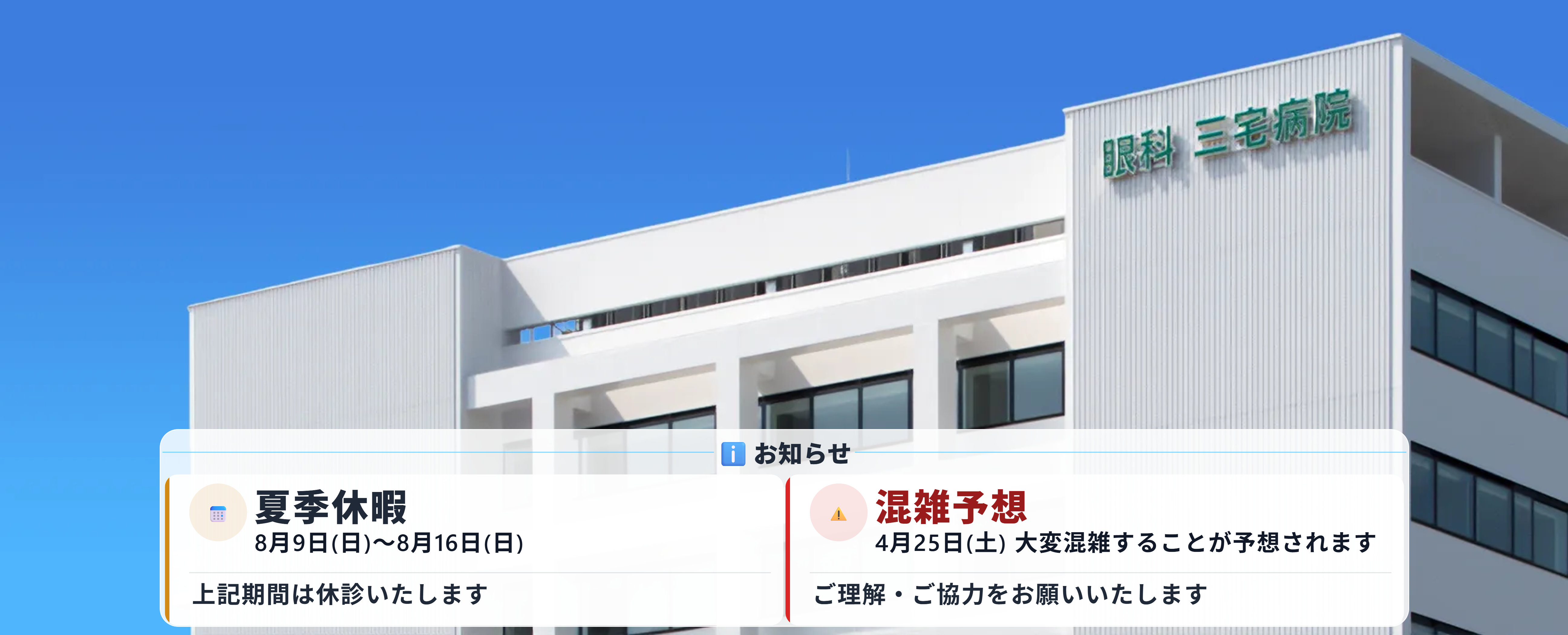 専門的な診療白内障手術に加え、緑内障、網膜硝子体、レーザー手術などの様々な手術に対応しています。また、専門家の少ない小児眼科および神経眼科等の専門医師による診療も行っています。 -