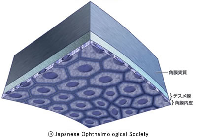 角膜は黒目の表面の5層から成る透明な組織であり(図1)、一番内側の層である「角膜内皮細胞」(図2)がその透明さを保つのに重要な役割をしています。白内障などの眼内手術の既往のある眼や、緑内障に対して周辺部レーザー虹彩切開術などの治療の既往や、角膜内皮細胞の変性疾患などがあると、この細胞の密度が減少します。角膜内皮細胞が、正常で1 mm2あたり3000個あるべきところ、500個以下になると角膜が混濁し、水疱性角膜症となります。