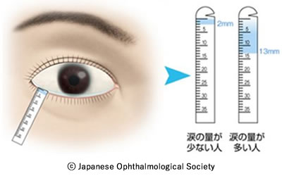 - シルマーテスト:小さなろ紙をまぶたにはさみ、涙の分泌量をしらべます (図4)