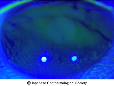 - 涙液層破壊時間(BUT)検査:診察室で涙を色素で染めて、目をあけたままにして、何秒で涙液膜が崩れ始めるかをしらべます(図5)