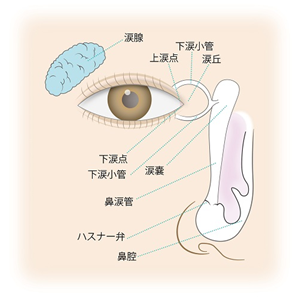 涙は「涙腺(るいせん)」で作られ、瞬きをすることで目の表面に広がります。一部は目の表面から蒸発し、大部分は「涙点(るいてん)」という、目頭の小さい穴から鼻の奥へ流れます。