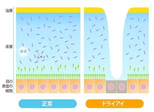 図2:健康な涙液膜(左側)とドライアイの涙液膜(右側)(日本眼科学会 目の病気「ドライアイ」)