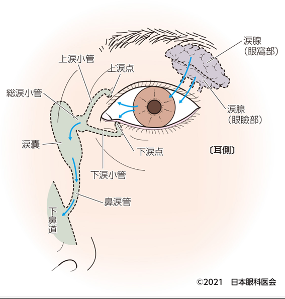 涙の多くは上まぶた外側に位置する主涙腺から分泌され眼表面を潤し、余分な涙は目頭にある上下涙点から排出され、涙点→涙小管→涙嚢→鼻涙管経由して下鼻道へと排出されます。涙点から鼻涙管を涙道と呼びます。